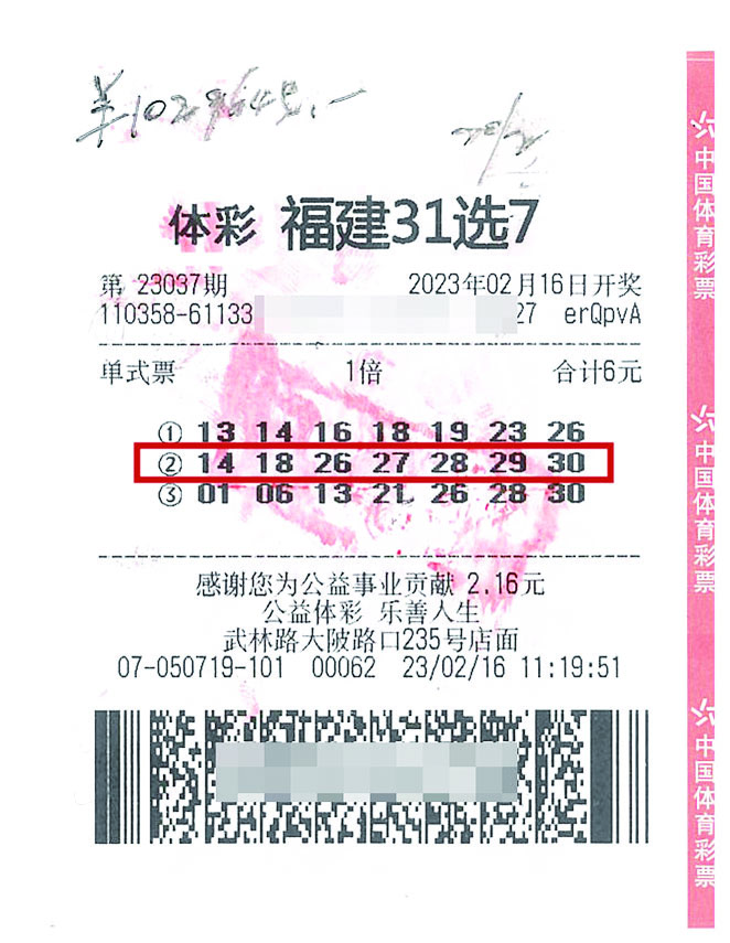 2月16日,福建31选7第23037期开奖,当期共开出3注一等奖,分别来自厦门、泉州和南平,单注奖金102万余元。