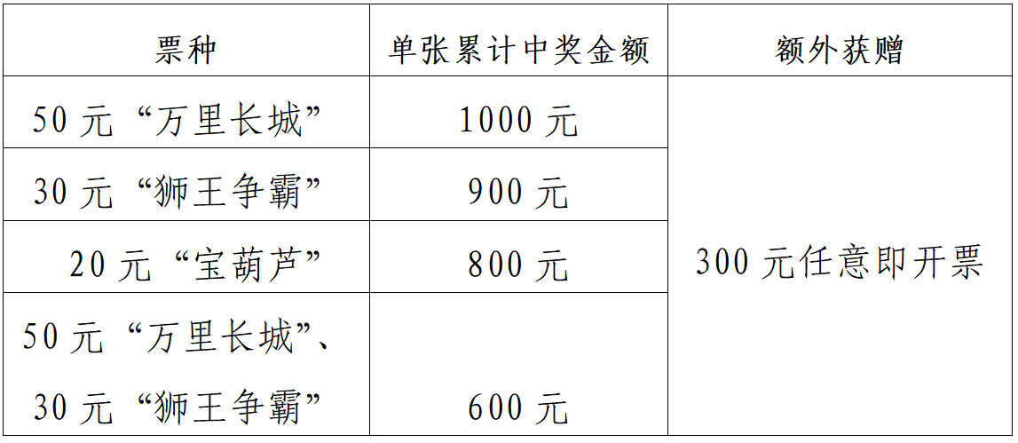 购彩者赠票活动4:2025年9月8日- 10月10日,凡购买本省范围内授权销售的面值50元“万里长城”和30元“狮王争霸”2款即开型体育彩票,单张彩票中得奖金金额累计为600元,除领取相应中奖金额外,可额外获赠价值300元任意即开票;
