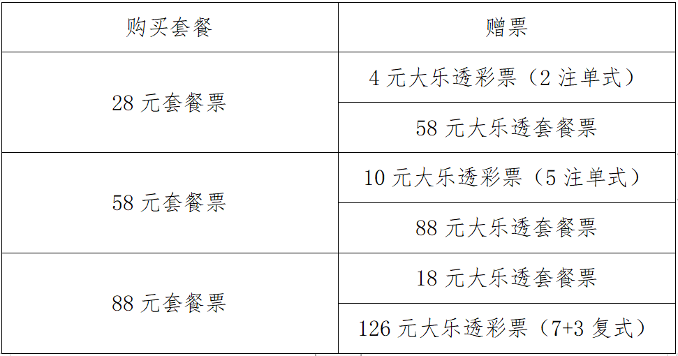 10月29日21:00起,凡在福建省内实体店购买超级大乐透28元、58元、88元套餐票,即可随机获得大乐透赠票1张,赠票率100%。