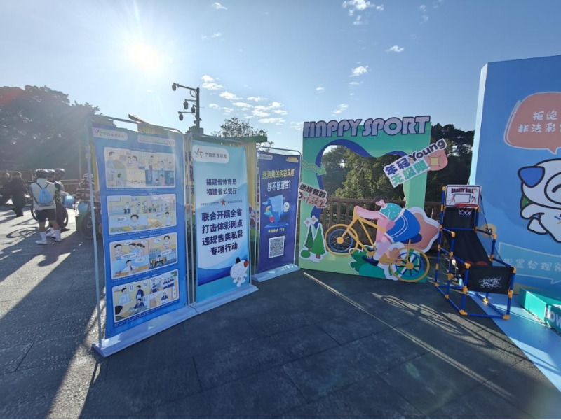 赛事活动现场,中国体育彩票展台,将责任彩票核心教育内容巧融于设计:“理性购彩,快乐相伴”的主题海报与土楼风光、骑行活力相映成趣;“守护未成年人,远离彩票诱惑”的提示语醒目突出;“依法维权,保障购彩者合法权益”“抵制非法彩票,共筑安全防线”“测测你的购彩风格”“省体育局省公安厅联合开展全省打击体彩网点违规售卖私彩专项行动”的宣传板块错落排布。驻足的市民感受赛事氛围的同时,也关注了理性购彩宣传。