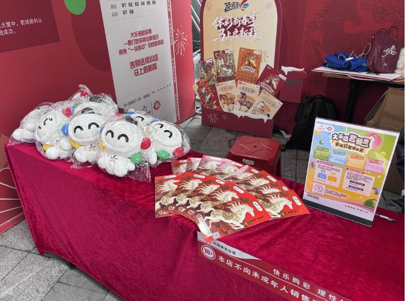 活动现场处处洋溢着马年新春的喜庆气息,年味十足的装饰设计瞬间俘获市民目光。顶部的马年吉祥挂饰随风轻摇,墙面不仅张贴着精美绝伦的即开票主题海报,“理性购彩 快乐同行” 的暖心标语更是醒目呈现,在营造欢乐氛围的同时,传递着体彩的责任与温度。