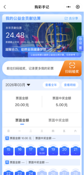 场景五:购彩手记。买一张彩票能为公益事业贡献多少?这是你的私人购彩日记,可以清晰地记录每一次购彩轨迹,直观感受自己为公益做出的贡献。让购彩有迹可循、有温暖可回味。