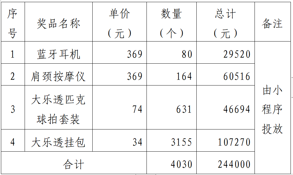 自4月8日21:10至4月29日21:00,在福建省内实体店购买第26037期至第26046期超级大乐透套餐票,在开奖后中奖的大乐透彩票通过“福建体彩”小程序/服务号参加活动进行扫码验奖,并关注“福建体育”公众号,即可获取抽奖机会(抽奖截止时间5月1日21:00),赢取蓝牙耳机、肩颈按摩仪、大乐透匹克球拍套装、大乐透包挂,具体如下: