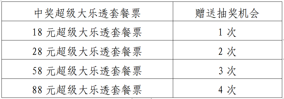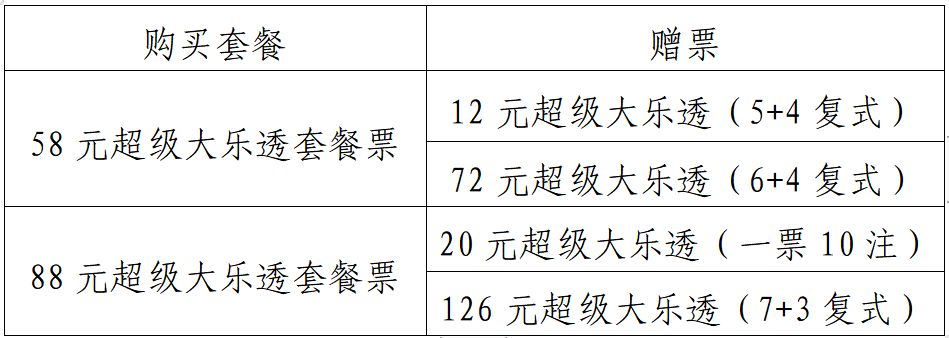 活动期间,凡在福建省内实体店购买超级大乐透58元、88元套餐票,即可获得随机超级大乐透赠票1张,赠票率100%,具体如下: