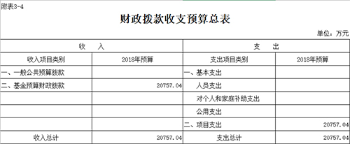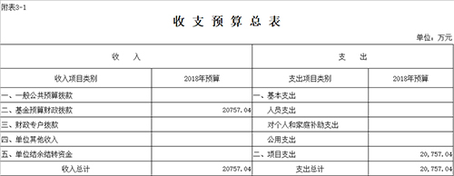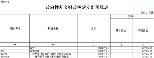 按照综合预算的原则,部门所有收入和支出均纳入部门预算管理。2018年,省体育彩票管理中心部门收入预算为20757.04万元,比上年增加 908.37万元,主要原因是增加了中央财政转移支付补助资金。其中:一般公共预算拨款0万元,基金预算财政拨款20757.04万元,财政专户拨款0万元,其他收入0万元,单位结余结转资金0万元。相应安排支出预算20757.04万元,比上年增加908.37万元,其中:人员支出4371万元,公用支出1040万元,项目支出15346.04万元。
