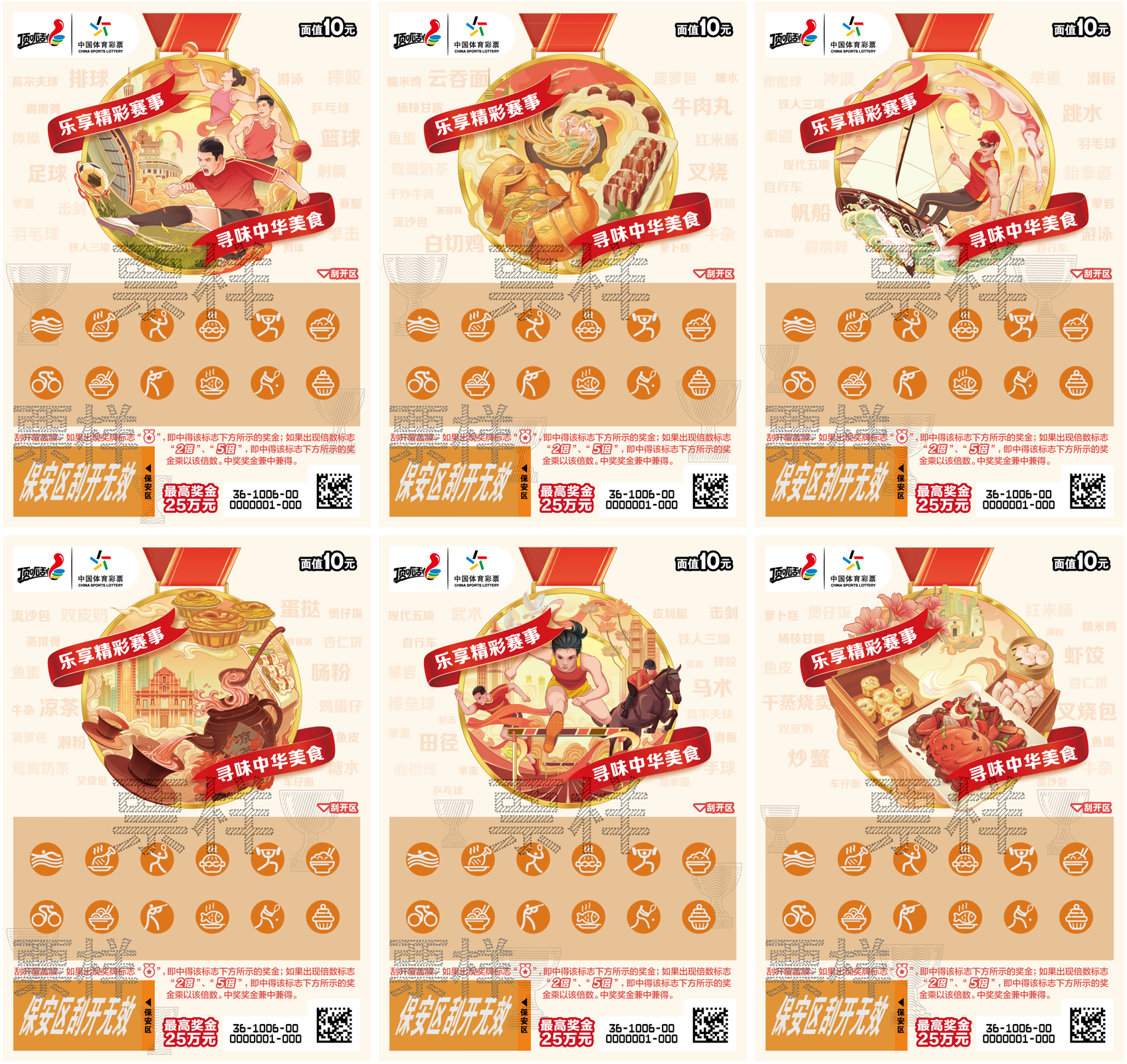 “享赛事 品美食”即开票则以“乐享精彩赛事 寻味中华美食”为主题,打造体育与饮食文化的跨界盛宴。这款票面值10元,共有6个票面场景,分别展现了赛事运动精彩瞬间和粤港澳经典美食画面。