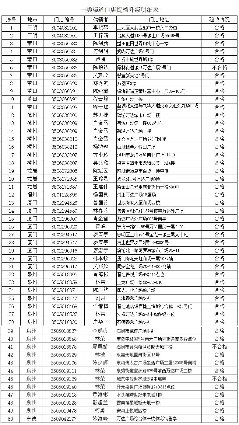 根据《关于开展一类渠道形象提档升级工作的通知》要求,此次报名形象提档升级的一类渠道50个,验收合格47个。公示3个工作日,如有异议,请拨打福建体彩客服热线:95086。