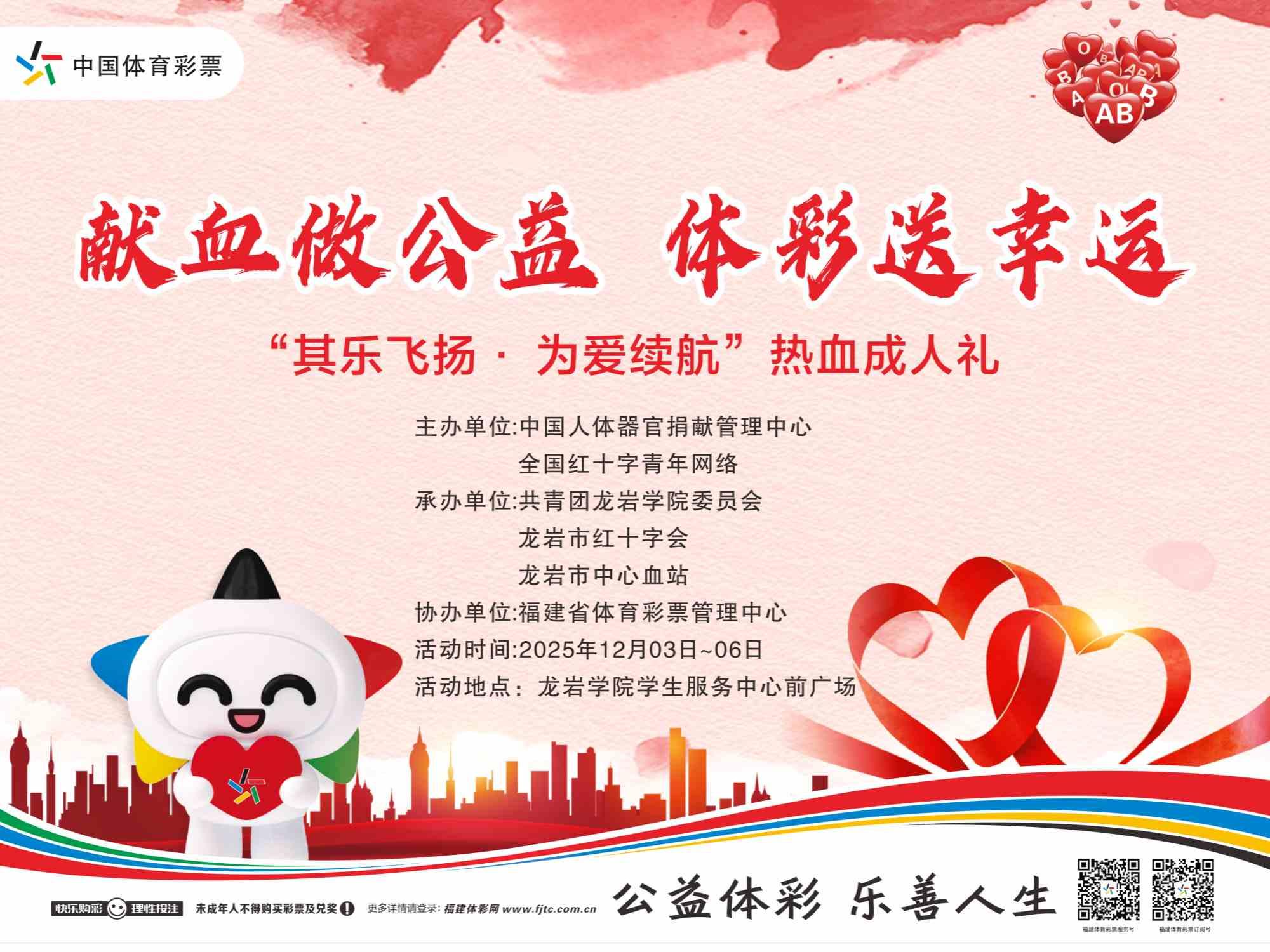 为进一步弘扬无偿献血公益精神,传递社会正能量,福建省体育彩票管理中心联合龙岩市中心血站,将于12月3日,在龙岩市龙岩学院学生服务中心前广场启动“其乐飞扬 为爱续航 无偿献血 体彩助力”公益活动。