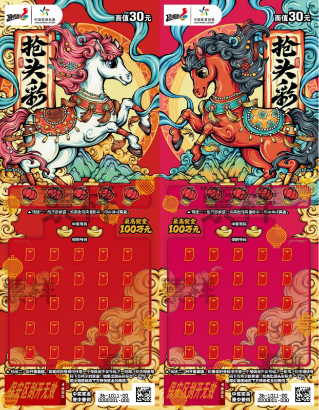 “抢头彩2026”面值30元,共有2个票面场景。今年,体彩顶呱刮继续携手东来也,采用国潮插画风格,用复古手绘形式描绘“骏马昂扬向上,抢得头彩”的画面,让新年“抢头彩”的美好祝福透纸而出。整体票面创新时尚,色彩明快,充满新国潮风范。