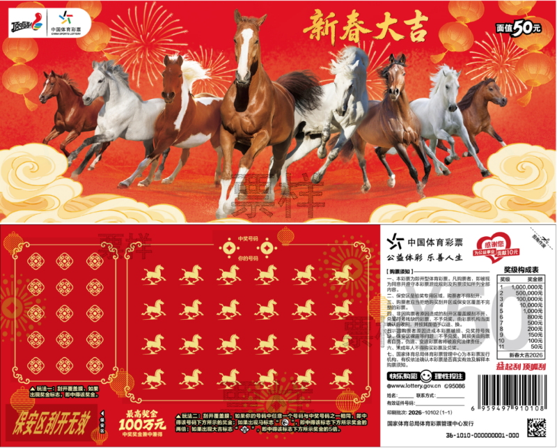 “新春大吉2026”面值50元,共有1个票面场景,票面采用了横版设计,整体色调采用喜庆的中国红,以八匹奔腾而来的骏马为主元素,金色祥云纹饰、火红灯笼点缀其间,烘托出热闹、喜庆的节日气氛及马年大吉的美好祝福。设计大气,票面还使用了特殊光油,让“新春大吉”的美好祝愿更加立体。刮开区设在票背,增强了这款票的收藏价值,是新春佳节传递喜悦、分享好运的时尚好物。