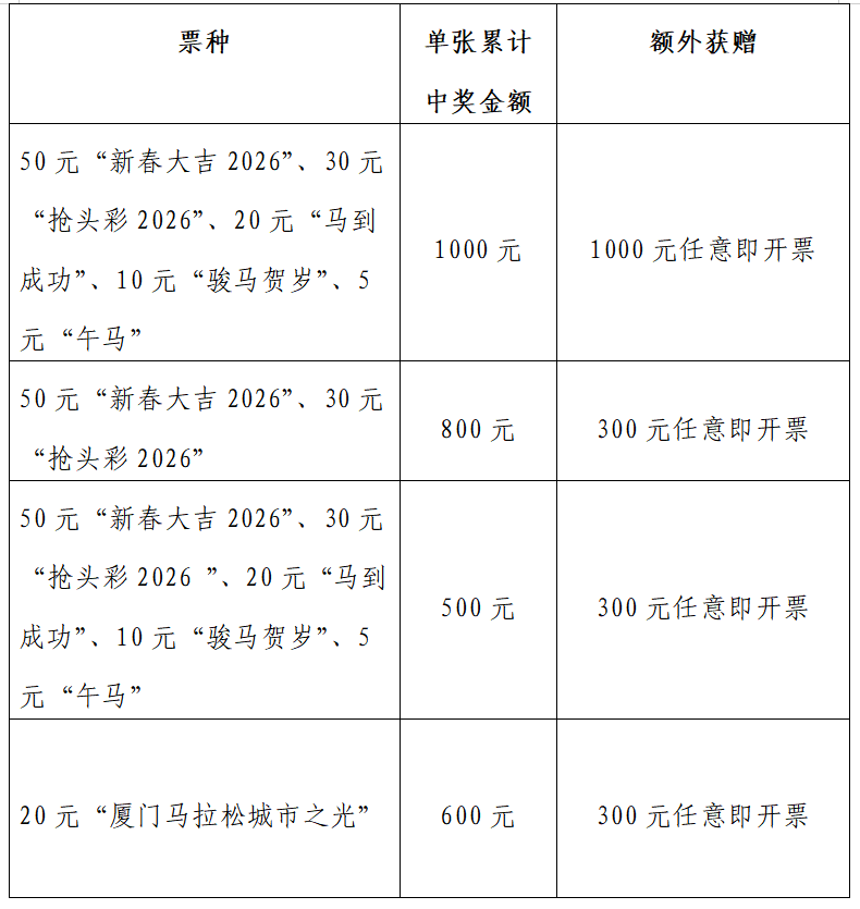 2026年1月16日至2月26日,凡购买本省范围内授权销售的面值20元的“厦门马拉松城市之光”主题即开型体育彩票,若单张彩票中得的奖金金额累计达600元,除领取相应中奖金额外,还可额外获赠价值300元的任意即开票。