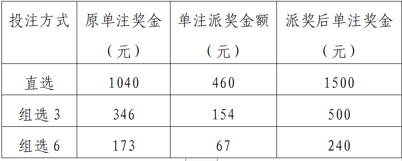 派奖期间,凡在福建省内实体店购买任意金额、任意投注方式(含多倍票)的排列3游戏,均可参与派奖。活动将根据排列3游戏不同投注方式按中奖注数进行派奖,具体如下表: