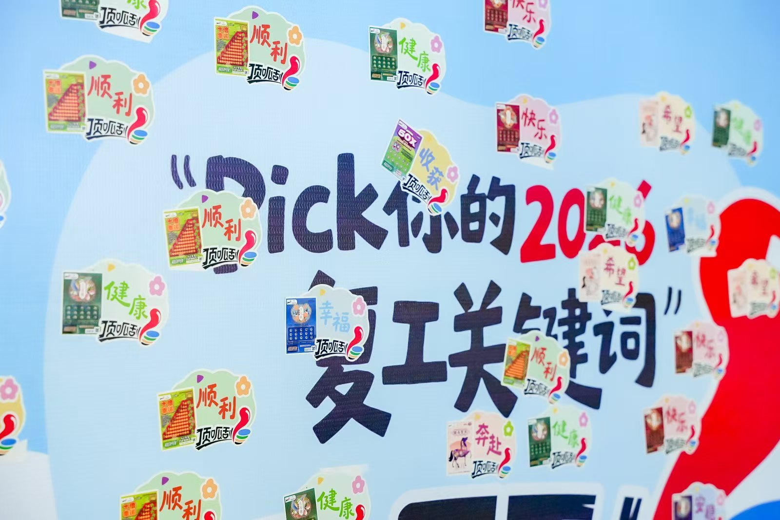 一旁的顶呱刮墙面互动区同样人气高涨。巨大的贴纸墙上,贴满了五彩斑斓的关键词贴纸。“健康”“快乐”“幸福”“奔赴”“收获”……市民们挑选着自己中意的复工关键词,或贴在墙上许下心愿,或收好带回家中,仿佛将一份美好的期许贴在了新一年的开端。