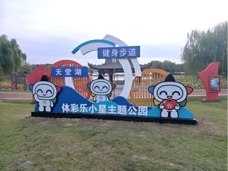 同时,活泼可爱的乐小星标识牌、花草牌点缀在步道两侧,与周边景致相映成趣,既增添了公园的趣味性,也让体彩元素自然融入群众健康生活。